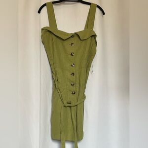 Stylish green romper with button-up front. Can be worn with our without self tie belt. Lined. Please note it is linen and subject to wrinkles. Great for spring and summer!