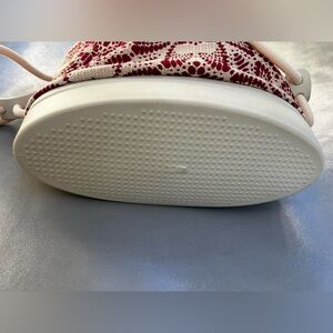 Patterned bag with a sturdy rubberized bottom. Gently used. Some imperfections on the string (pictured) Unlined, small zippered hidden pockets on the side.