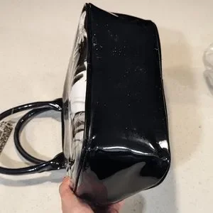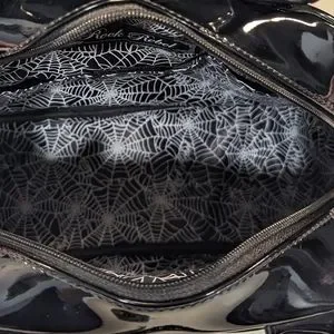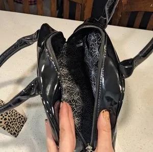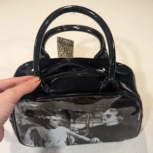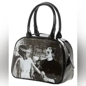 Rock Rebel We Belong Dead Bowler Handbag cuz home is where the grave is. Come alive (or not) with this haunting handbag that has a patent vegan leather construction with iconic Frankenstein graphics all ova and a top zip closure.