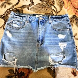 Trendy distressed denim skirt perfect for casual outings. Features a classic blue color with stylish rips for a modern look.