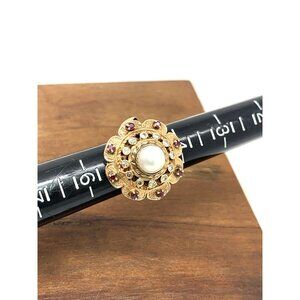Pearl Ruby Diamond Women's Cocktail Ring 14k Yellow Gold Vintage Estate Size 5.5