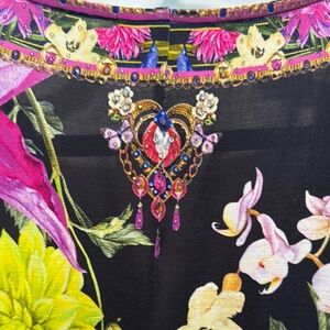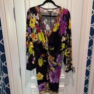 Elegant long sleeve dress with vibrant floral patterns. Features a deep V-neck and a flattering fit. Perfect for any occasion.