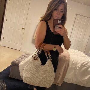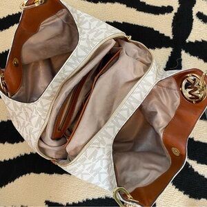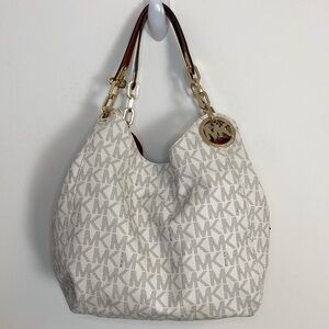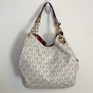 MICHAEL KORS Cream Logo Slouchy Shoulder Tote Bag Brown Leather & Gold Chains