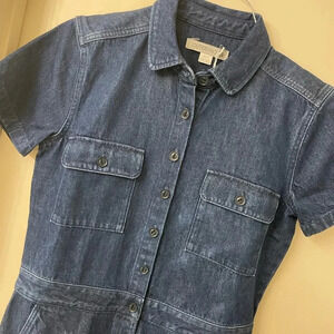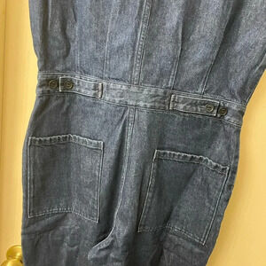 Stylish denim jumpsuit with short sleeves. Features button-up front and chest pockets. Perfect for casual outings.