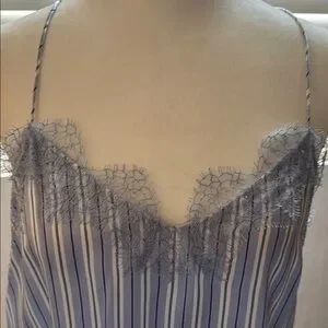 Elegant blue striped camisole. Features delicate lace trim. Perfect for layering or wearing alone. 100% silk with lace trim.