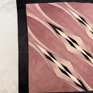 Elegant silk scarf with a geometric pattern. Features shades of pink and black.