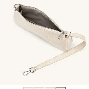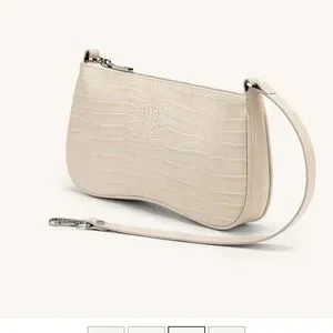 This cream shoulder bag features a chic crocodile embossed texture, offering a stylish and minimalist design. Its compact baguette shape and metal hardware make it a versatile accessory for any occasion.