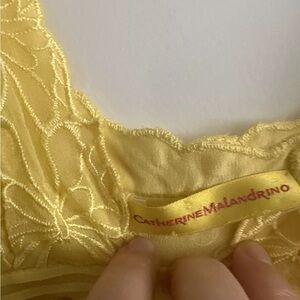 Elegant yellow dress with butterfly embroidery details. Sleeveless design.