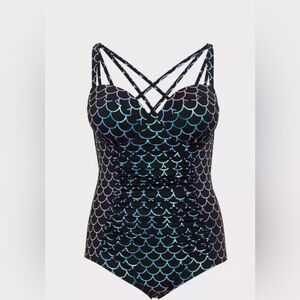 Torrid Slim Fix Underwire Strappy Back One Piece Black Swimsuit w/ Mermaid 3/3X