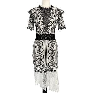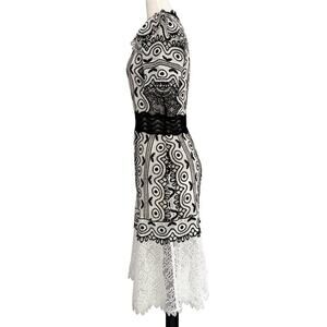 Keywords: Sea NY Lola dress, black and ivory lace dress, embroidered cocktail dress, sheer lace detail, wedding guest dress, event-ready dress, Sea New York designer