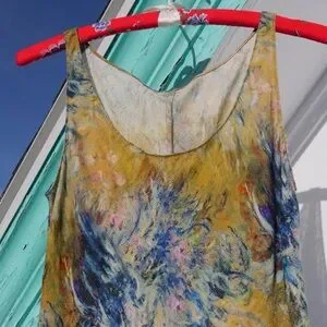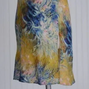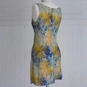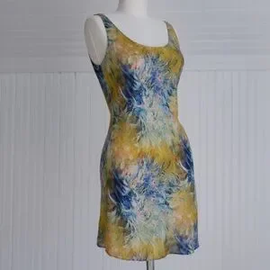 Feels like a woven cotton or linen, abstract print, scoop neckline, flattering bias cut, deep side vents, mini length, fun for layering or bravely wearing solo