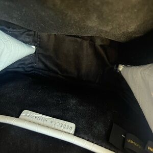 Elevate your style with the Rebecca Minkoff Black and White Croc-Embossed Circle Bag. This chic accessory features a striking black and white design, perfect for any occasion. Does not include strap.