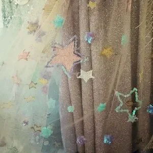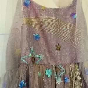 Don’t remember the maker of this dress but it was small batch handmade. Enchanting purple tulle dress with star and moon patterns. Perfect for special occasions. No size tag but I bought it for my daughter around 10yrs old. Higher hem in the front and lower in the back.