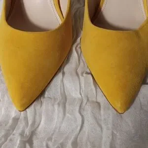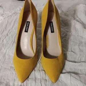 Elevate your style with these striking yellow heels from Nine West, crafted in a luxurious suede-like material. Featuring a pointed-toe design and a low-cut vamp, these 4 inch heels offer a sleek and minimalist silhouette perfect for any occasion. The light-colored interior adds a touch of elegance to these standout shoes.