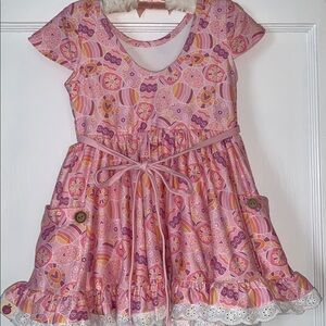 Adorable pink floral dress. Soft and comfortable fabric with a cute Easter egg design. Perfect for egg hunts and your Easter holiday!