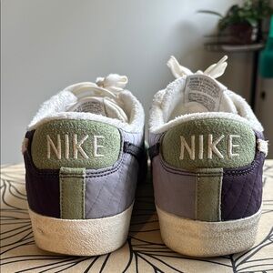 Stylish Nike sneakers with a unique quilted design. Features a mix of green, purple, and cream colors. Perfect for casual wear.