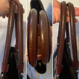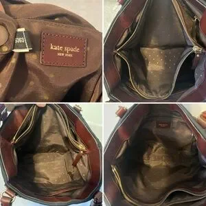 This elegant Kate Spade tote combines a sleek black body with sophisticated brown leather accents, offering a timeless and professional look. Has three internal compartments with a zipper on the center compartment. In excellent used condition, has very minor wear on the leather and some faint stains on the inside lining (pictured). The nylon is black and the leather is a pretty deep brown/mahogany color.