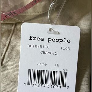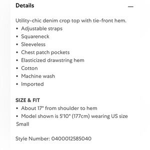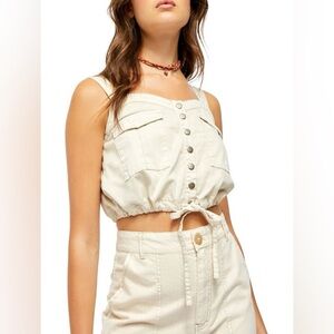 Free People • We the Free • Palm Desert denim crop tank size XL - new NWT. This Utility-chic denim crop top with features a tie-front hem.m,Adjustable straps, Squareneck, Sleeveless, Chest patch pockets, Elasticized drawstring hem &made of Cotton. Brand new with tag attached. Approx flat lay measurements in pics -
