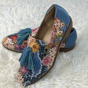 👉🏻 These loafers are inspired by French art and culture, featuring a polka-dot print with tasseled detailing and printed stretch goring for a comfortable fit. They are made with hand-painted leather, showcasing a blend of metallics, faux croco print, and floral velvet prints.