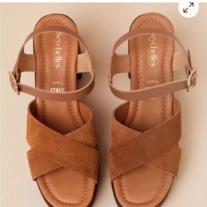These Seychelles platform shoes showcase a rich brown hue with a chunky block heel for added height and style. The adjustable ankle straps with gold-toned buckles ensure a secure fit, while the suede-like material provides a luxurious feel. Perfect for elevating any outfit, these shoes blend modern design with timeless appeal.