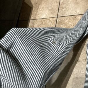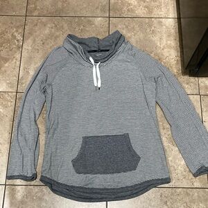 Casual striped gray tunic style top with a front pocket. Perfect for everyday wear. No hood. Can roll sleeves up some and button