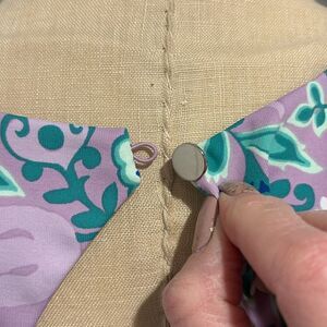 Sleeveless shift dress with jewel neckline, pull over and hits at the knee. Cut open back with elastic loop button and snap loops to hold bra straps in place. 93% Nylon, 7% Spandex - machine wash code. See pictures for length and armpit to armpit measurements.