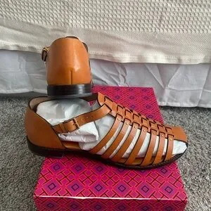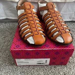 Stylish brown leather gladiator sandals with gold accents. Perfect for casual outings.