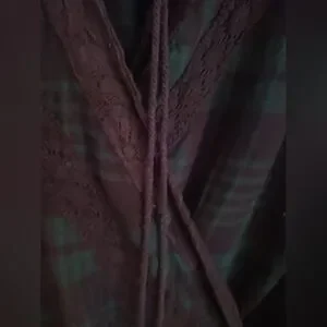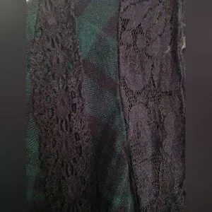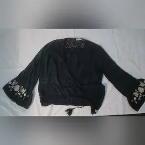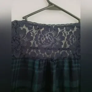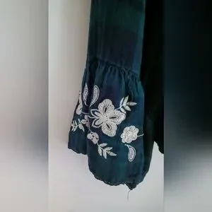 Stylish women's top featuring a blue plaid design with elegant lace details. Beautiful floral embroidered bell sleeves. Perfect for casual outings or a night out. Size Medium. No holes, rips, or stains. Smoke free home,