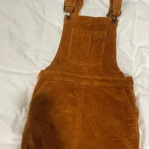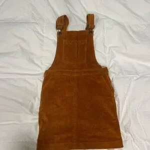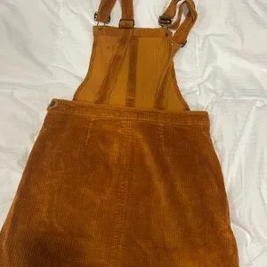 Stylish brown/yellow corduroy overall dress. Features adjustable straps and front pocket.