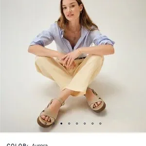 A lightweight, stacked EVA midsole in camel with a knit rand in a shimmery metallic beige for elevated style.