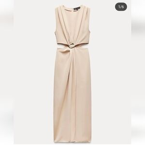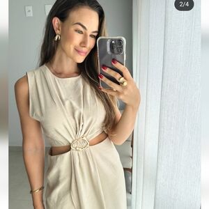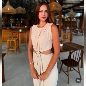 Step out in style with this elegant cream sleeveless dress. Perfect for any occasion, this dress features a chic cut-out design and a sophisticated silhouette. Ideal for those who love a touch of elegance in their wardrobe.