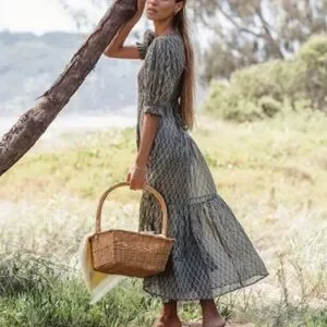 Embrace casual elegance with this black and white tiered maxi sundress from Daughters of India. Featuring a v-neckline and short puff sleeves, this dress offers a relaxed fit with a flowy silhouette perfect for any laid-back occasion. The tiered layers add a touch of romantic charm, making it a versatile addition to your wardrobe.