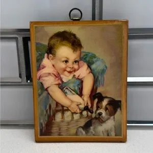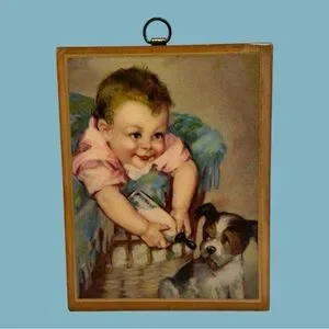Charming wall art featuring a baby and a dog. Perfect for adding a nostalgic touch to any room. Soft pastel colors enhance its vintage appeal.