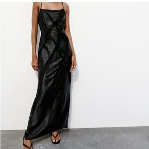 Zara NWT black satin & mesh floral appliqué slip maxi dress with spaghetti strap