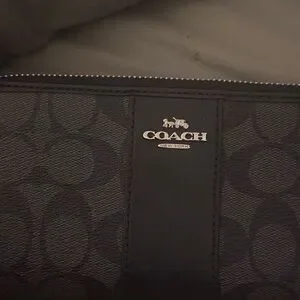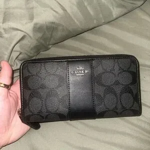 Elegant Coach wallet. Features signature pattern. Sleek black design. Perfect for everyday use.