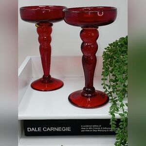 Beautiful red glass candle holders. Perfect for adding a touch of elegance to any room.