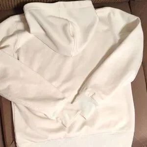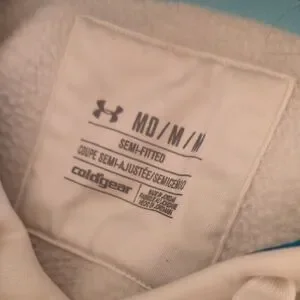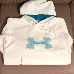 Stylish Under Armour hoodie. Cream color with light blue/teal logo. Comfortable and trendy.