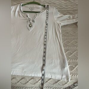 EUC excellent condition! No flaws! Beautiful rayon blouse with embroidery neckline design by Chico’s! 3/4 Sleeve. Soft & comfy. Measurements in photos. Women’s size Large. Chico’s size 2. Smoke free home