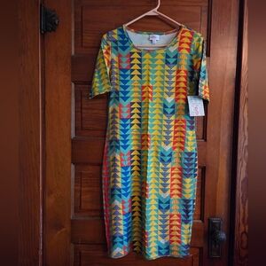 NWT multi-colored LuLaRoe Julia. A fitted & figure flattering, soft material dress. Great for work or a night out. So colorful, it would look great with a solid color sweater, cardigan, blazer, etc.