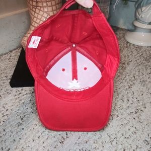 EUC Nice red ball cap with "Canada" and maple leaf symbol embroidered in white from Strong And Free brand. Ball cap also has white stripe along brim of hat, and Velcro strap back adjustment. Please see all photos.