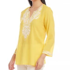 Karen Kane tropic sun 💯 cotton voile tunic top. Embroidery.3/4 length sleeves. Size M.