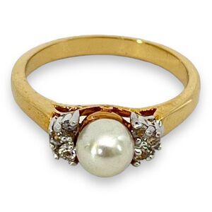 Gorgeous 14KT gold plated ring featuring a simulated pearl with cubic zirconia accent stones. The band is plated in yellow gold and the tips of the prongs are plated in white gold.