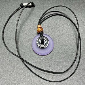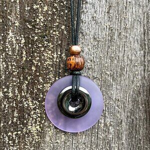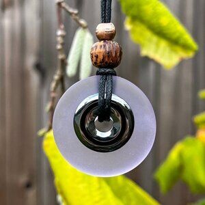 This Hematite and Cultured Sea Glass pendant is handcrafted by my husband and I. We use high quality gemstones and slabs in all our pieces. It has an adjustable waxed cotton cord so it can accommodate most outfits!