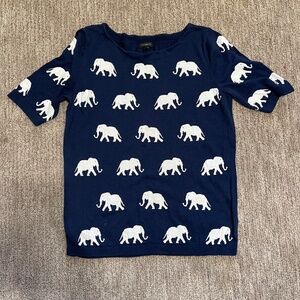 This adorable Talbots sweater is the perfect lightweight piece for fall, spring, and summer wear. Featuring a charming white elephant print on a navy blue background, this sweater adds a playful yet polished touch to any outfit.