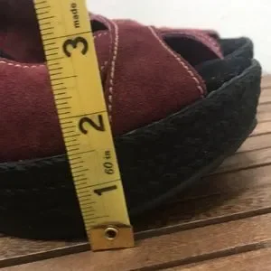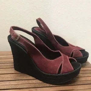 Suede upper, man-made platform wedge sole with braided rope look. Color is burgundy wine, with tan stitching.