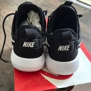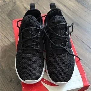 Stylish black sneakers with a white swoosh. Perfect for casual wear.