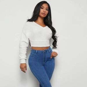 NEW| Women’s Shein White V-Neck Cropped Long Sleeve Cozy Sweater