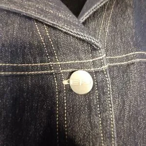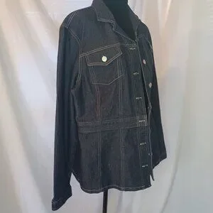 Classic and flattering, this stretch denim jacket by Evan Picone features a dark wash with bold contrast stitching and a belted waist for a tailored silhouette. Designed with a collared neckline, long sleeves, button-down front, and four functional pockets for utility and style.
