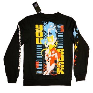 Level up your wardrobe with this bold and limited-edition PaymoneyWubby Cloudy You Suck Kitten Club crewneck sweater. This eye-catching piece features colorful anime-inspired pin-up girl graphics, 3D puff print text, and bold phrases like “YOU SUCK” (in English) and "NAUGHTY GIRL" (in Japanese) across the front and back. The vivid red, yellow, and blue design pops against the black background, while starburst graphics and "PaymoneyWubby" written in calligraphy down the sleeves adds extra flair. Crafted from soft, cozy material with a relaxed fit, this unisex sweatshirt is perfect for fans of PaymoneyWubby or anyone who loves unique, statement streetwear.