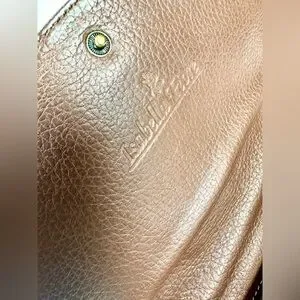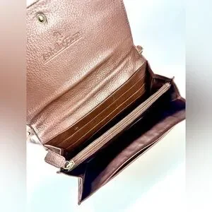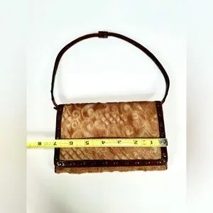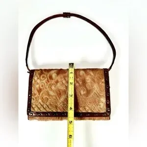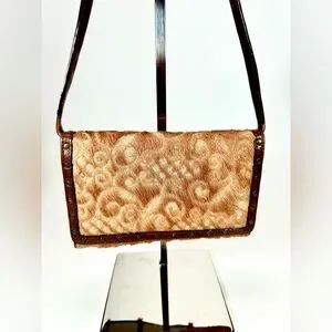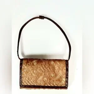 The image shows an Isabella Fiore purse, identified by its distinctive design and the brand's label. It is a brown, rectangular clutch-style bag featuring a floral pattern that appears to be embossed or stitched into the material. The purse's exterior seems to be made of fur or a fur-like material, adding a tactile element to its design. The edges of the purse are trimmed with dark brown leather, which is punctuated by small, round metal studs, giving it a slightly rustic or bohemian look. The handle or strap, also made of dark brown leather, is attached to the sides with similar metal studs, suggesting a well-constructed and detailed accessory. The warm tones and the floral motif give the purse a vintage or retro feel, characteristic of Isabella Fiore's style, which often incorporates intricate details and unique textures. Isabella Fiore was known for creating handbags with elaborate designs, often featuring beading, embroidery, and unique materials. The brand's purses frequently have a bohemian or vintage aesthetic, making them stand out from more mainstream designs.
